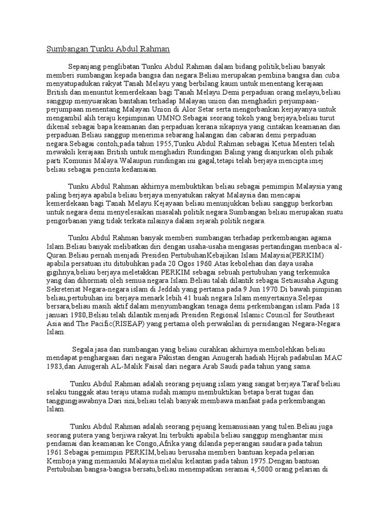 Sumbangan tunku abdul rahman sepanjang penglibatan tunku abdul rahman dalam bidang politik. Kepentingan pendidikan terhadap tamadun melayu_revisited.pdf. Download view sumbangan tunku abdul rahman as pdf for free. Sepanjang penglibatan tunku abdul rahman dalam bidang politik,beliau banyak memberi sumbangan kepada bangsa dan negara.